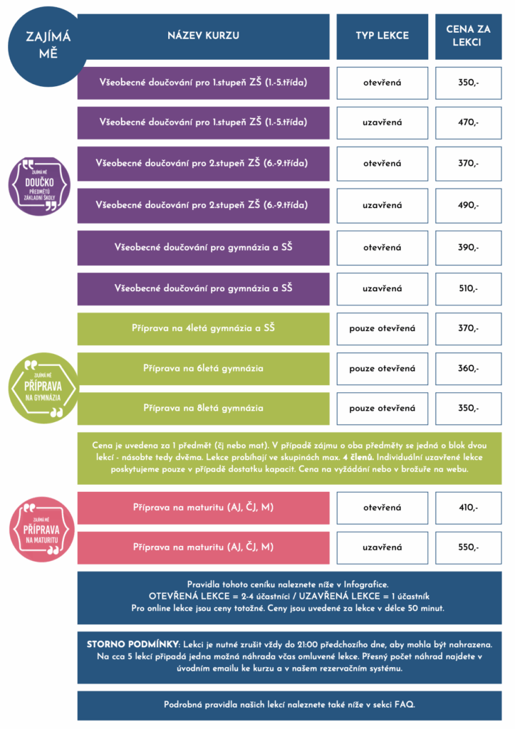 Naše lekce se většinou platí na celý semestr (září až leden a potom únor až červen/do termínu přijímaček). Pokud nechcete / nemůžete platit na celý semestr, je možné platit po jednotlivých lekcích (či několika pár lekcích), ale cena jedné lekce je potom vyšší o 50,-.