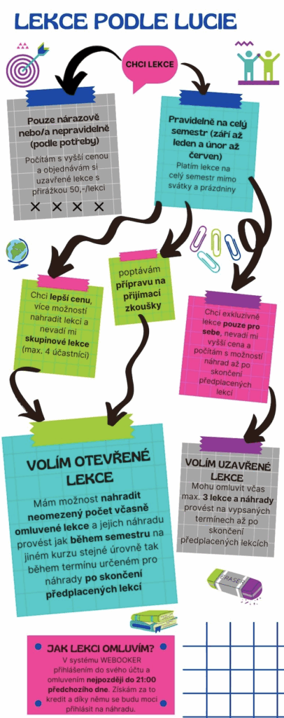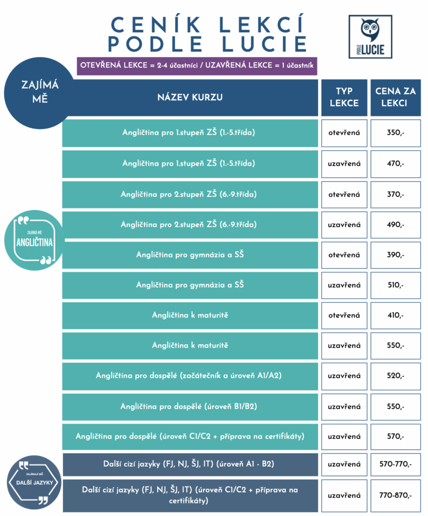 Na základě infografiky na našich webových stránkách (http://www.podlelucie.cz) se naše lekce dělí na 2 typy: